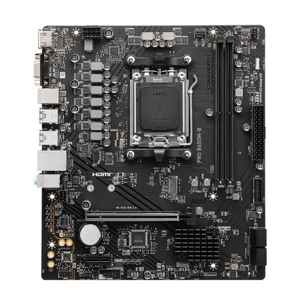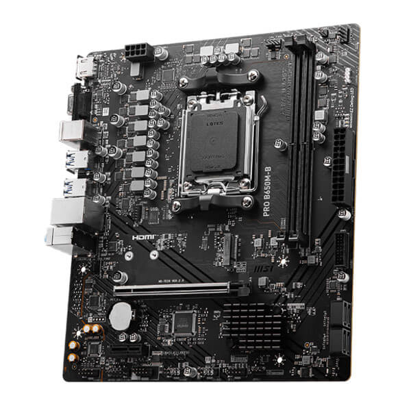 Features: Supports AMD Ryzen™ 9000 / 8000 / 7000 Series Desktop Processors Supports DDR5 Memory, Dual Channel DDR5 6800+MHz (OC) Core Boost : With premium layout and digital power design to support more cores and provide better performance Memory Boost: Advanced technology to deliver pure data signals for the best performance, stability and compatibility Lightning Fast Game experience: PCIe 4.0 slot, Lightning Gen 4 x4 M.2 2.5G LAN: Upgraded network solution for professional and multimedia use. Delivers a secure, stable and fast network connection AUDIO BOOST: Reward your ears with studio grade sound quality for the most immersive gaming experience Steel Armor: Protecting VGA cards against bending and EMI for better performance, stability and strength Specifications: Model Name PRO B650M-B Chipset AMD B650 CPU Supports AMD Ryzen™ 9000 / 8000 / 7000 Series Desktop Processors Socket AM5 Memory 2x DDR5, Maximum Memory Capacity 96GB Memory Support DDR5 6800+(OC)/ 6600(OC)/ 6400(OC)/ 6200(OC)/ 6000(OC)/ 5800(OC)/ 5600(OC)/ 5400(OC)/ 5200(OC)/ 5000(OC)/ 4800(JEDEC) MHz Max. overclocking frequency: • 1DPC 1R Max speed up to 6800+ MHz • 1DPC 2R Max speed up to 6000+ MHz Supports Dual-Channel mode Supports non-ECC, un-buffered memory Supports AMD EXPO Onboard Graphics 1x HDMI™ Support HDMITM 2.1, maximum resolution of 4K 60Hz 1x VGA Support VGA, maximum resolution of 2048x1536 50Hz, 2048x1280 60Hz, 1920x1200 60Hz Slot 1x PCI-E x16 slot 1x PCI-E x1 slot PCI_E1 Gen PCIe 4.0 supports up to x16 (From CPU) PCI_E2 Gen PCIe 3.0 supports up to x1 (From Chipset) Storage 1x M.2 M.2_1 Source (From CPU) supports up to PCIe 4.0 x4 , supports 2280/2260 devices 4x SATA 6G RAID Supports RAID 0, RAID 1 and RAID 10 for SATA storage devices USB 2x USB 2.0 (Rear) 4x USB 2.0 (Front) 4x USB 3.2 Gen1 Type A (Rear) 2x USB 3.2 Gen1 Type A (Front) LAN Realtek® RTL8125BG 2.5G LAN Audio Realtek® ALC897 Codec 7.1-Channel High Definition Audio Internal IO 1x Power Connector(ATX_PWR) 1x Power Connector(CPU_PWR) 1x CPU Fan 2x System Fan 2x Front Panel (JFP) 1x Chassis Intrusion (JCI) 1x Front Audio (JAUD) 1x Com Port (JCOM) 1x Addressable V2 RGB LED connector (JARGB_V2) 1x RGB LED connector(JRGB) 1x TPM pin header(Support TPM 2.0) 4x USB 2.0 ports 2x USB 3.2 Gen1 Type A ports LED FEATURE 4x EZ Debug LED BACK PANEL PORTS HDMI™ VGA Keyboard/Mouse USB 3.2 Gen 1 5Gbps (Type-A) LAN port Audio connectors USB 2.0 OPERATING SYSTEM Support for Windows® 11 64-bit, Windows® 10 64-bit PCB Info mATX 215mmx243.84mm Warranty 3 Years Note *** Features, Price, Specifications are subject to change without notice.